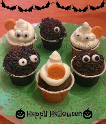 En mi blog Sabrina's Sea of Colors encontrarás estos divertidos y sencillos Halloween Cupcakes. Unos son de calabaza especiada y otros de chocolate y calabaza. La mezcla para el bizcocho se consigue mezclando calabaza hervida o asada con harina, chocolate, azúcar y huevo, entre otros ingredientes. Para la decoración necesitas preparar un frosting, en mi caso he elegido el de que queso que es mi favorito y al que te he dejado enlace en la entrada. También necesitarás fondant, colorante naranja y negro, 2 boquillas y manga pastelera, entre otros ingredientes. Así podemos hacer unos fantasmas blancos con ojos de fondant y unos monstruos con frosting teñido de negro. Los mejor es que los niños pueden participar en la decoración y quedan deliciosos!.