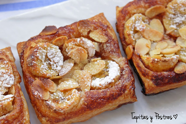 Y finalmente esta opción que como veis además de plátano añade más frutas de temporada, pero que podéis adaptar sin problema a prácticamente cualquier fruta que ronde por la nevera. La base es una lámina de hojaldre, después una crema de leche o incluso natillas (compradas), y luego las frutas.