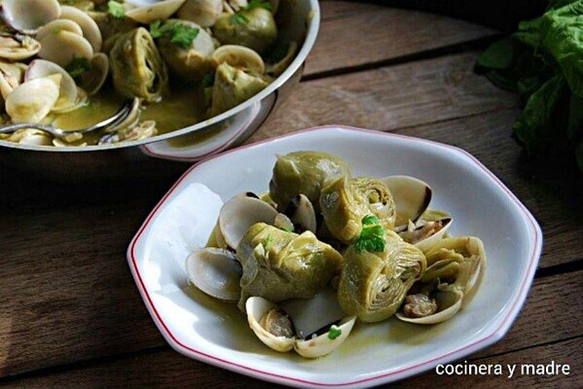 Alcachofas con almejas - La receta de Rosa es un plato sencillo pero delicioso que además puedes preparar aún mas fácilmente si utilizas alcachofas de bote, aunque es estupendo utilizar las de temporada. Para hacer esta deliciosa recetas vas a necesitar alcachofas, almejas, ajo, cebolla, vino blanco, aceite de oliva, sal y perejil fresco. Para prepararlo habrá que cocer las alcachofas si son naturales, rehogarlas con la cebolla, añadir los demás ingredientes y dejar cocer unos minutos, puedes ver AQUÍ LA RECETA