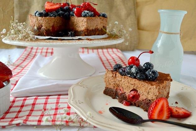 Para finalizar os enseño una tarta deliciosa de la Selva Negra, en forma de mousse. Desde el blog de Cocina Familiar, os traigo una tarta deliciosa y espectacular para que la hagas estas fiestas. Le hemos dado la vuelta a la típica tarta de la Selva Negra y la hemos convertido en un mousse de chocolate delicioso. Para hacerla hemos utilizado un brownie de chocolate pero se puede hacer con cualquier bizcocho de chocolate o con una base de galletas de chocolate u Oreo. Necesitaremos además, chocolate negro fondant, nata (o crema de leche), leche, vainilla, gelatina, cerezas al marrasquino, cacao en polvo, arándanos y fresas. Haremos el mousse derritiendo el chocolate y mezclándolo con la leche y la gelatina. Montaremos la nata y lo mezclaremos con la preparación anterior. Ponemos el bizcocho en la base, repartimos las cerezas y cubrimos con el mousse. Enfriamos y luego decoramos con el cacao en polvo y las frutas. Muy sencilla de hacer y más de comer. ¡Apúntatela para estas fiestas!