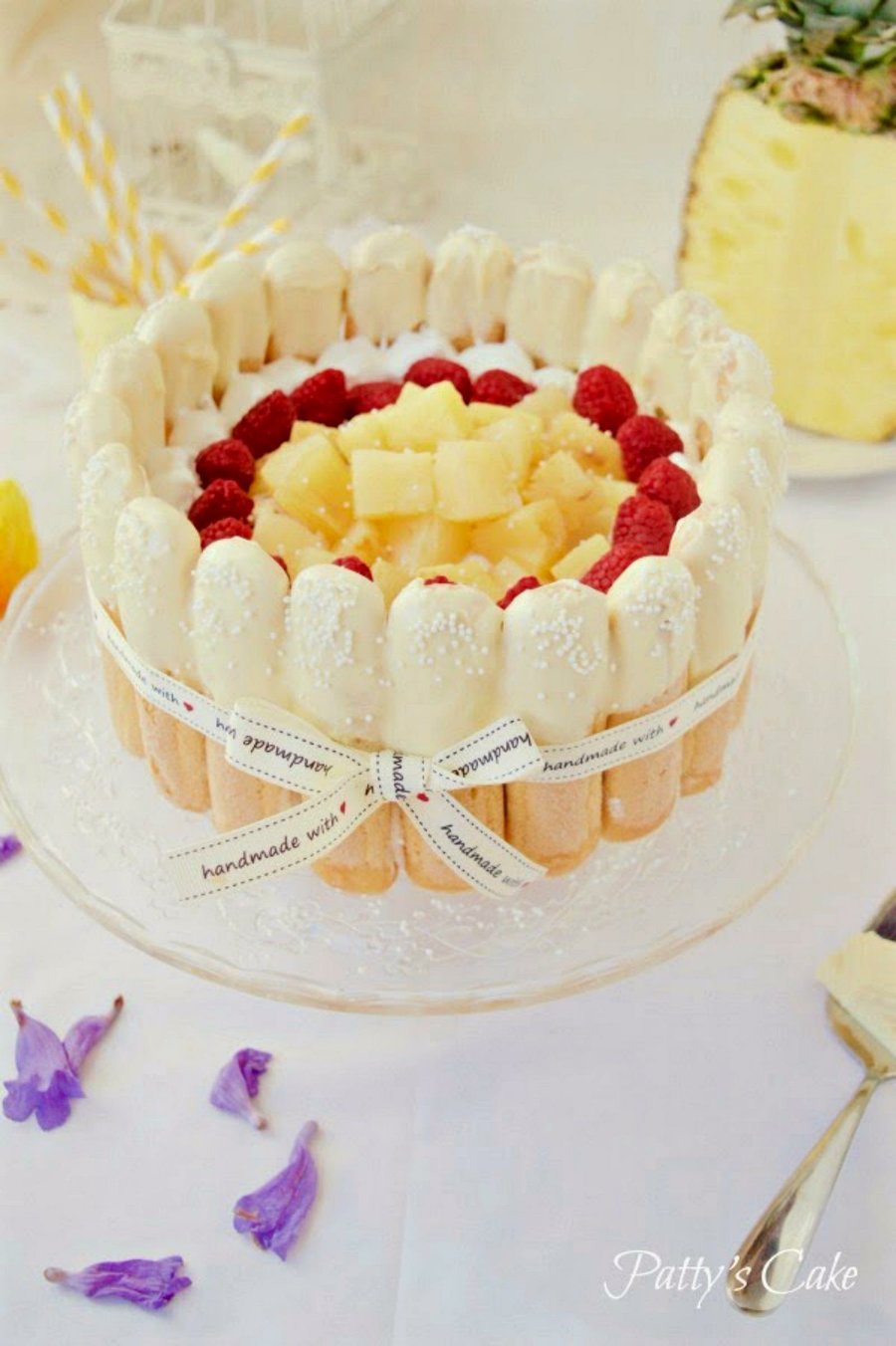 Desde nuestro propio blog, Patty's Cake, os deleitamos con una tarta de crema de piña que lleva una capa de dulce de leche, merengue y frambuesas. Es una tarta muy sencilla, que podéis hacer el día antes y que está deliciosa, aparte de lo bonita que se verá en vuestra mesa navideña. Para hacerla necesitaremos: bizcochitos duros, piña, zumo de piña, ron, azúcar, dulce de leche, gelatina de piña, gelatina neutra, nata (crema de leche), clara de huevo, azúcar glas, chocolate blanco y frambuesas. Su elaboración va por partes y aunque parezca pesada, merece la pena. Formamos la base con los bizcochitos remojados en los líquidos y cubrimos con el dulce de leche. Hacemos una crema con la piña triturada, las gelatinas y la nata, cubrimos los bizcochitos y enfriamos. Montamos el merengue. Derretimos el chocolate y mojamos los bizcochitos con los que rodearemos la tarta. Decoraremos con el merengue y las frutas. Sensacional, ¿verdad? Pues venga, que te espero para darte las cantidades y todas las instrucciones paso a paso.