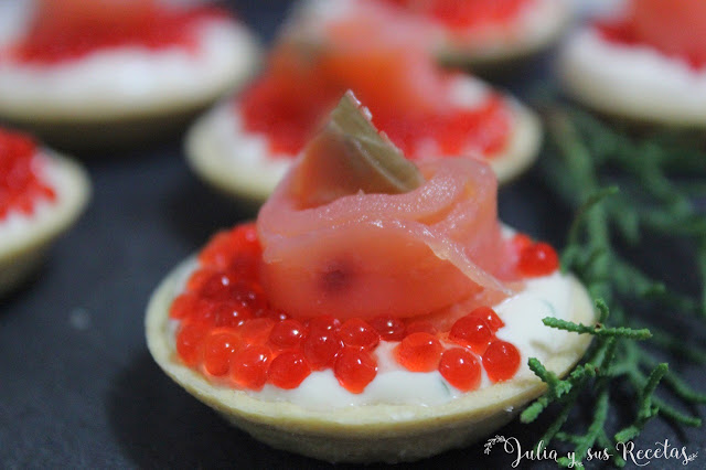 Los ingredientes son: Tartaletas compradas, salmón, queso, yogur, cebollino, huevo hilado, huevas de pescado, aceite de oliva y sal. Es tan sencillo como mezclarel queso con el yogur y el cebollino, rellenar ocn esta mezcla las tartaletas y decorar con el resto de ingredientes. ¡Y no veas lo bonito que queda!