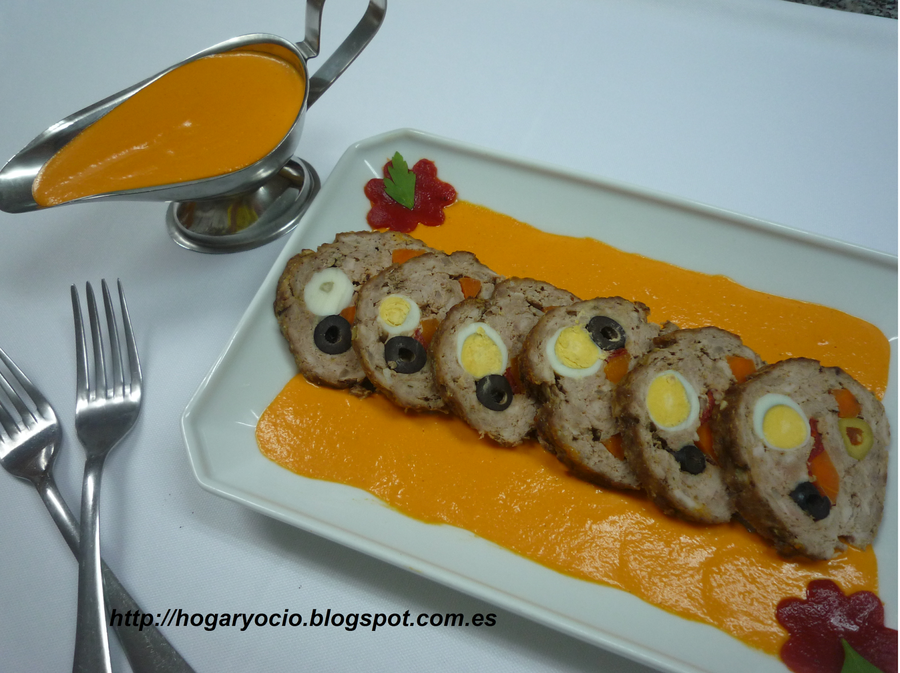 Necesitaréis carne picada, cebolla, ajo, huevo, sal y pimienta. Y para el relleno de la carne: aceitunas, huevos de codorniz, zanahoria y pimientos. Se trata de condimentar la carne, amalgamar con el huevo y agregar la cebolla y ajo muy picaditos. Luego se estira sobre una lámina de papel vegeta y se rellena con aceitunas, huevos cocidos, pimiento... Se enrolla y se hornea. Opcionalmense se sirve con una salsa elaborada con pimientos de piquillo y nata. Para conocer todos los secretos de la receta pincha aquí: rollo de carne relleno con salda de piquillos