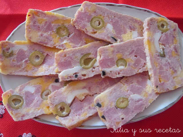 Los ingredientes de esta receta son: lonchas de jamón cocido pequeñas, atún, huevo duro, aceitunas, mayonesa, así como otras cosillas que mencionan en el blog.