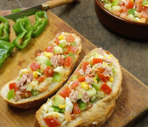 Solo tendremos que picar todos los ingredientes , aliñarlos y servirlos bien fresquito en cuencos o encima de tostas como en esta ocasión.