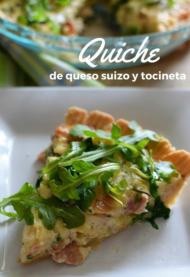 En Bizcochos y sancochos he encontrado esta Quiche de queso suizo y tocineta. Para la masa casera mezclamos harina, mantequilla, sal y agua fría y se deja reposar. Luego se estira, se acomoda en el molde y se rellena con una mezcla de cebolla, tocineta y queso, entre otros ingredientes. Se hornea hasta que cuaje, retiramos y podemos decorar con arúgula fresca.