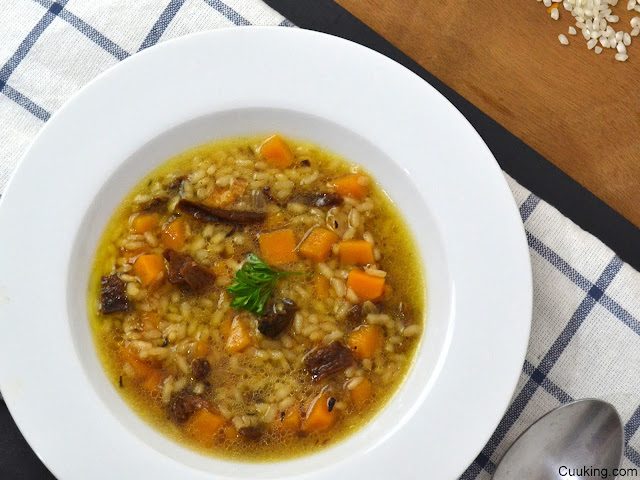 Necesitaremos además de arroz, calabaza, setas, cebolla, ajo...y un toque de especias que podéis ver en el blog Cuuking.