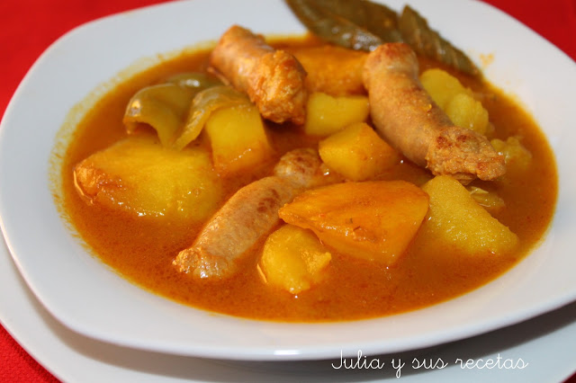 Solo tenemos que comprar unas salchichas frescas. Sofreírlas en la olla con un poquito de aceite, añadimos cebolla y ajo picados, los sofreímos y añadimos las patatas y algún ingrediente mas que verás en mi blog Julia y sus recetas, y cubrirlas con agua. Las dejamo hacer 10-12 minutos y listas para comer.