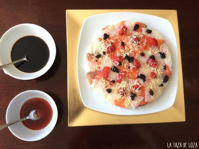 Se prepara el arroz tipo "japónico" y se pone en la base del molde de la tarta los ahumados cortados pequeños, se añade la capa de arroz y encima se ponen las fresas y el aguacate cortado pequeño. otra capa de arroz blanco y se sirve con salsas soja o picante wasabi.