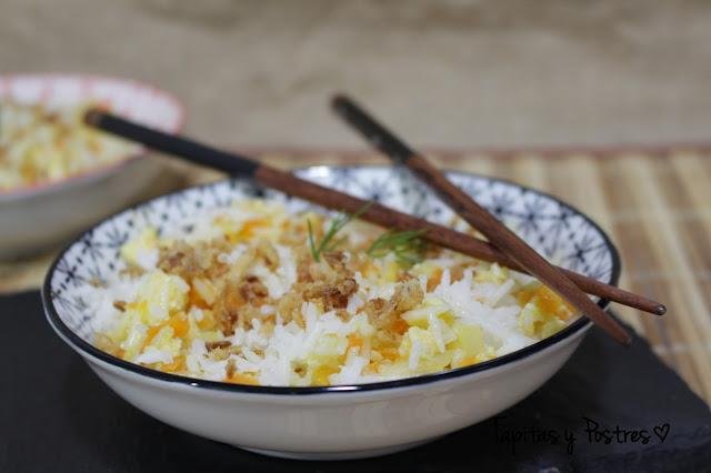 En una sartén amplia hacemos un sofrito con la cebolla y la zanahoria picadita, en la misma sartén a fuego medio echamos los tres huevos batidos y la sal y dejamos que se hagan cono si fuera para tortilla francesa, cuando estén casi listo, removemos enérgicamente y rompemos. Añadimos al sofrito. El arroz se hace con un poco de aceite y ajos cortados pequeños. Servimos acompañado de cebolla crujiente. En el título tenéis la receta completa.