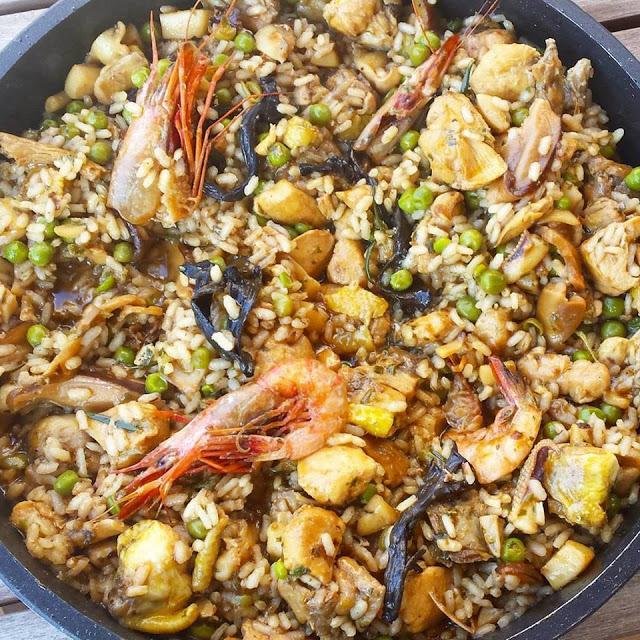 5.- Un mar y montaña, y en cazuela, que receta tan sabrosa y buena. La propuesta es de Pilar de Les receptes que m'agraden. Necesitaras: cebolla, ajos, arroz, pollo, costillas, conejo, gambas, sepia, vino blanco, pimiento verde y rojo y guisantes. Los consejos para preparar esta receta los tienes en el blog de Pilar en ESTE ENLACE.
