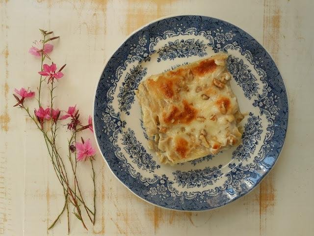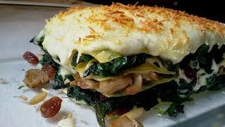 En el blog Anna Recetas Fáciles podemos encontrar esta deliciosa lasaña, la preparamos remojando las láminas y reservamos. Por otro lado cocinamos las espinacas en una sartén junto a los piñones y las pasas, reservamos. Por otro lado salteamos champiñones con ajo y otros ingredientes. Se monta la lasaña colocando una capa de láminas luego capa de las espinacas cocidas otra de láminas y otra de champiñones finalizamos con láminas, bechamel y queso. Horneamos, para ver al detalle la receta clic a continuación: