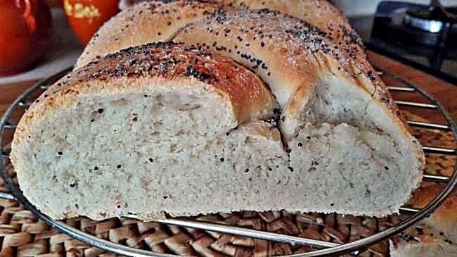 Para preparar esta receta, disuelve la levadura en agua. Bate el aceite y añade los huevos, incorpora la harina. A continuación añade a la mezcla, una parte de las semillas de amapola. Mezcla con las varillas, hasta obtener una masa elástica. Haz un rulo alargado con la masa y córtalo en tres partes y haz una trenza. Unta con un poco de aceite, espolvorea por encima el resto de las semillas y un poco de sal. Introduce el pan en una bolsa de asar y déjalo reposar. Hornea y listo.