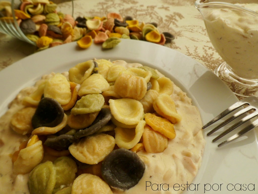 Poner diferentes tipos de pasta en nuestra mesa es también un modo de salir de la rutina y llamar la atención de los niños, por ejemplo. Eso es lo que opinan también en Para estar por casa, y de allí os traigo un plato de Orecchiette con salsa parisienne. Además de las orecchiette, que es una pasta que, como su nombre indica, tiene forma de pequeñas "orejitas", necesitaremos leche, mantequilla, harina, nata, pollo o jamón cocido, cebolla y estragón. La pasta, como es habitual, la cocemos siguiendo las indicaciones del fabricante. Para la salsa, rehogamos la cebolla y el pollo, y elaboramos una especie de bechamel con la nata, la leche y la mantequilla. Mezclamos todo y lo ponemos sobre la pasta. Delicioso. Tenéis todos los pasos de la elaboración aquí.
