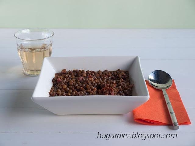 Ricas y nutritivas, son estas lentejas que nos preparan desde Hogar Diez, ponemos las lentejas el día anterior en remojo, trituramos cebolla, ajo y tomates, lo sofreímos en aceite y junto con un poco de beicon, chorizo; le incorporamos una hoja de laurel, un poco de pimentón y las lentejas cubrimos con agua y dejamos cocer durante 30 minutos.