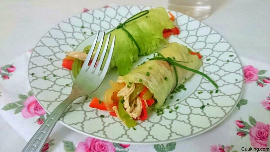 Esta receta del blog Cuuking me encantó nada más verla, me parece perfecta para este tema que nos ocupa y no creo que tarde en hacerla. Necesitamos: hojas de lechuga Iceberg, pechuga de pollo, pimiento italiano, pimiento amarillo, pimiento rojo, cebolla, comino, chile, ajo, zumo de limón, sal, pimienta, aceite de oliva y cebollito. Ponemos aceite en una cacerola, pochamos la cebolla, luego agregamos el pimiento cortado en tiras, y el pollo, también en tiras, más las especial y dejamos cocinar. Luego formamos los rollitos con las hojas de lechuga y anudamos con el cebollino.
