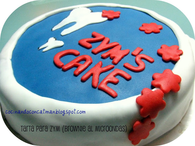 Primero hacemos el brownie, derretimos el chocolate al microondas y lo mezclamos con la leche , la mantequilla, la harina y el resto de ingredientes, lo ponemos en un molde apto para microondas, lo cocemos durante 11 minutos a 700w. Lo sacamos , dejamos enfriar y lo cubrimos con el fondant a nuestro gusto.