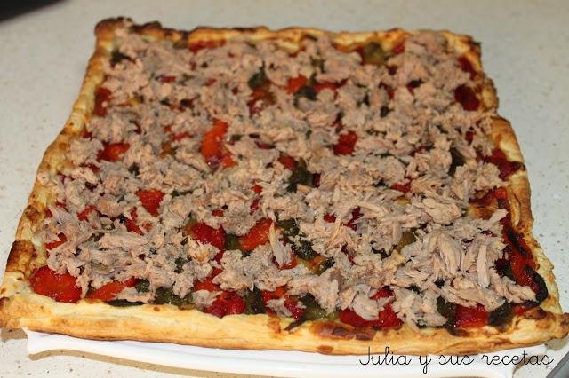 En este caso preparamos la masa con harina, agua tibia, sal y levadura. La dejamos fermentar. Estiramos. Añadimos el tomate, el atún, el queso. (Y cuaquier cosa que nos guste) Y horneamos. ¡Seguro que queda deliciosa! Te aconsejo que para ver todos los detalles pulses sobre el titulo de esta receta.