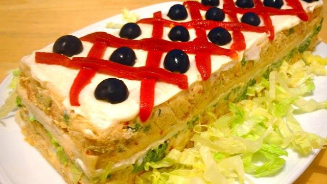 Para prepararlo necesitamos el relleno que preparamos con atún, mayonesa, huevo duro picado y unas verduras cocidas. Montamos el relleno en un molde rectangular intercalando capas del relleno entre capas de pan de molde y lechuga picada. Dejamos enfriar, desmoldamos y decoramos ¡Y ya lo tenemos hecho! Si quieres ver todos los detalles pulsa sobre el titulo de esta receta.
