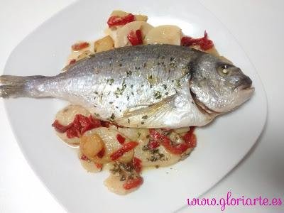 No es por nada, pero esta Dorada al horno del blog Gloriarte pide a gritos ser comida y al igual que la anterior recetas es muy fácil de elaborar, solo que esta lleva un poco más de ingredientes. Ponemos en una bandeja para hornear; tomate, cebolla pimiento, patatas entre otros ingredientes. Horneamos previamente y luego colocamos encima las doradas, espolvoreamos sal y hierbas picaditas y llevamos al horno nuevamente hasta que esté lista, servir caliente. Puedes ver al detalla la preparación haciendo clic a continuación: