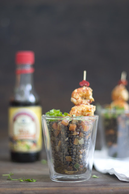 Ensalada de lentejas beluga y gambas