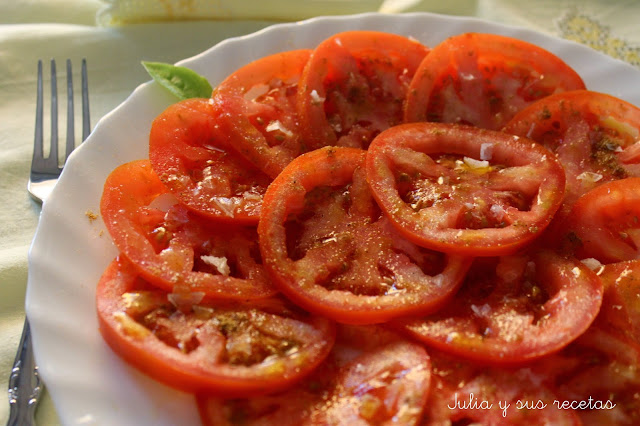 Solo tendremos que tener tomates de muy buena calidad , cortaros en rodajas y espolvorearlos con ajo, comino molido y un truquillo que podéis ver en la receta.