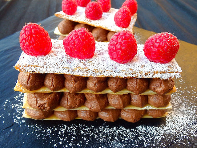 Horneamos el hojaldre evitando que nos suba demasiado, tiene que quedar finito... después hacemos la trufa y vamos poniendo capas de hojaldre y de trufa alternativamente..la decoramos con azúcar glas y frambuesas... muy rica.