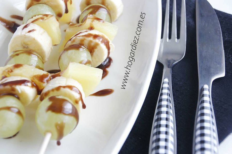 Un postre muy sencillo pero perfecto para que todos en casan coman fruta como nos cuentan desde el blog Hogar Diez, una brocheta de frutas variadas bien limpias y cortadas, las que más te gusten o tengas en casa, en este caso ha utilizado uvas, piña y plátanos que combinan a la perfección; el boche final y que le da este toque especial a estas brochetas es el de un sirope casero de piña hecho a base de una crema de azúcar y mantequilla casi hasta caramelizar y aromatizada con canela y cacao. Servimos por encima de la fruta y a disfrutar.