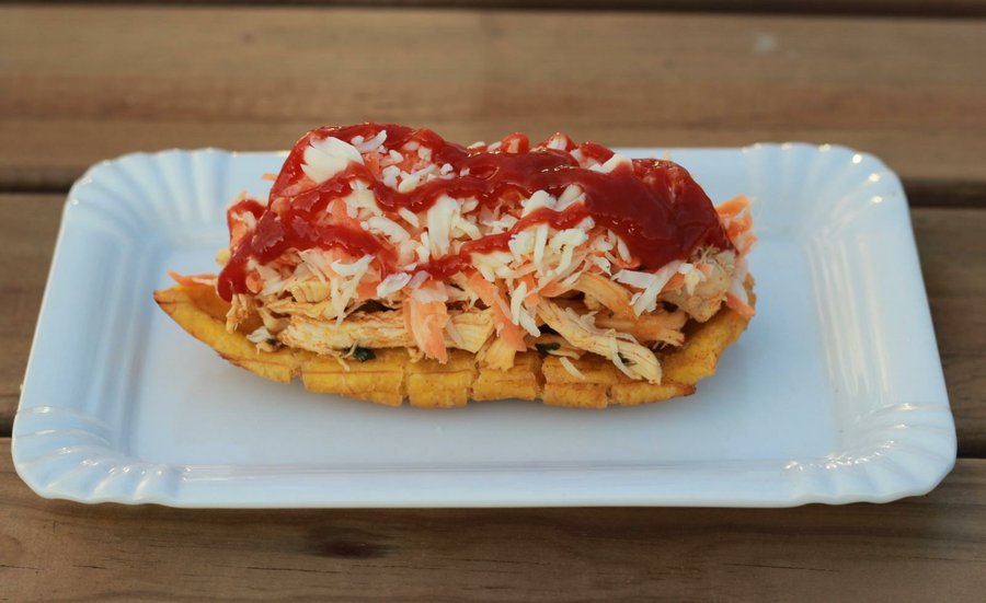 Por último te dejo una receta un tanto diferente inspirada en esas delicias que se ven en Colombia o Venezuela, se realiza con plátano macho verde. La combinación de sabores es deliciosa y se hace friendo el plátano verde dos veces, la primera vez-en este caso- ½ plátano y luego lo machacas y vuelves a freír, le colocas una capa de pollo guisado, una capa de repollo rallado, zanahoria rallada y salsas a tu gusto. Por último queso rallado si te apetece y a degustar calentito. Puedes ver paso a paso la elaboración de la receta a continuación: