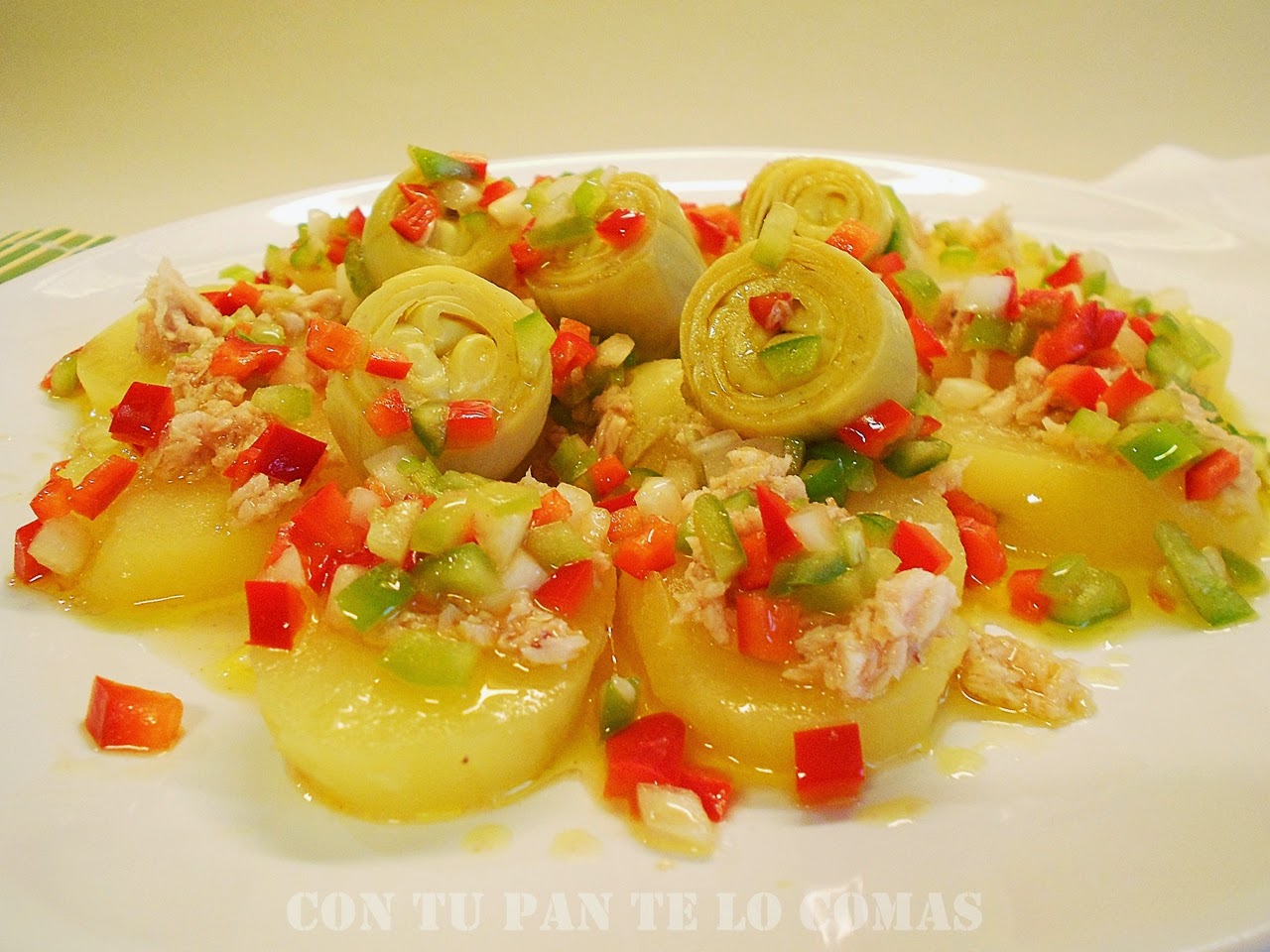 6.- ENSALADA DE PATATAS CON ALCACHOFAS Y VINAGRETA DE PIMIENTOS.- (Ver Receta).-