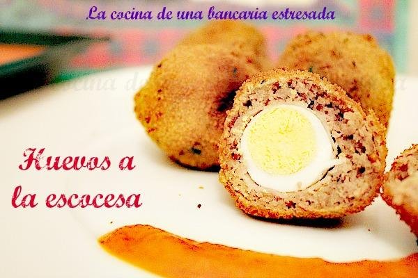 Me encanta esta receta de la cocina de una bancaría estresada, cocemos los huevos durante 5 minutos y enfriamos inmediatamente. Aparte preparamos la carne mezclándola con yema de huevo, sal , salsa perris, pan rallado y mostaza. Pelamos los huevos y los pasamos por harina; los colocamos en el centro de la carne picada y le damos forma de bola. Las pasamos por harina, huevo y pan rallado y freímos en abundante aceite caliente. En este caso su autora los acompaña con una salsa de piquillos.