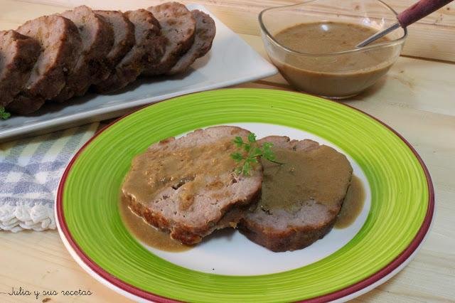 Una receta muy sencilla del blog Julia y sus recetas, juntamos en un bol carne picada, cebolla frita y paté hacemos un cilindro con ella que envolveremos en papel de horno y horneamos a 200ºC 1 hora dándole la vuelta a media cocción. Servimos con salsa bovril.
