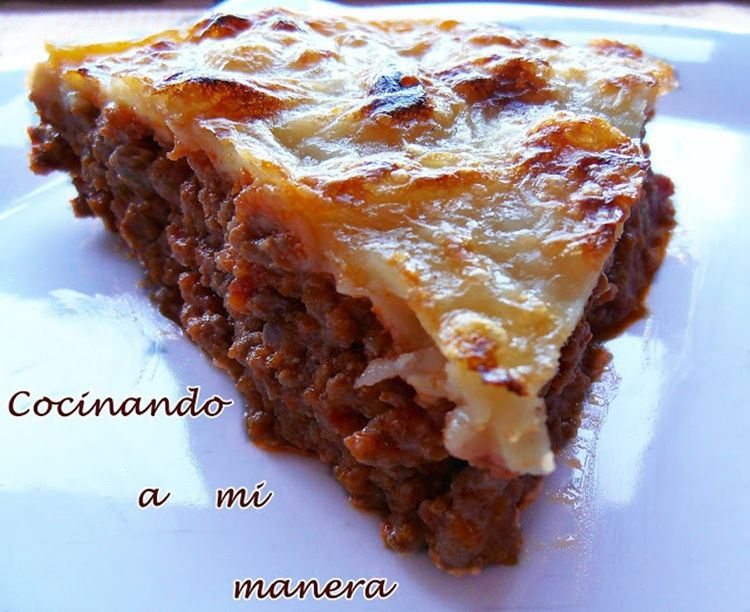 Esta receta es del blog Cocinando a mi manera. Sofreímos cebolla, ajo , zanahoria y beicon cuando empiece a coger color añadimos la carne picada, cuando empiece a coger color le vertemos leche y dejamos que reduzca hacemos lo mismo con el vino blanco. Seguido le incorporamos los tomates, el tomate frito y las especias al gusto. Dejamos cocer el conjunto. Mientras tanto cocemos las patatas y una vez cocidas las trituramos con nata, mantequilla y nuez moscada, hasta conseguir una crema. Montamos el plato colocando la carne abajo, cubierta con el puré y espolvoreado con queso y gratinamos.