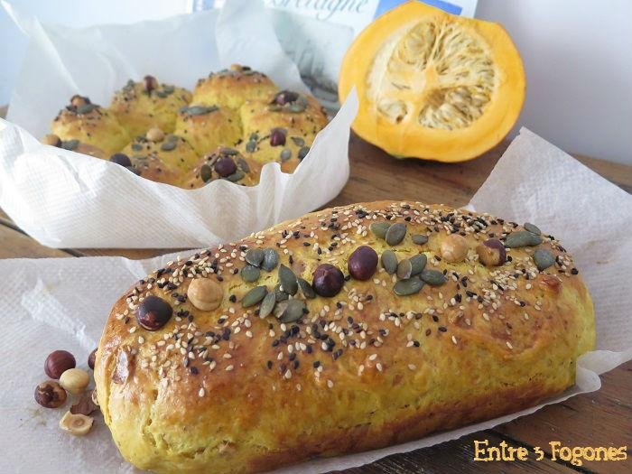 El blog Entre 3 Fogones nos asegura que este pan es delicioso en sabor y con una textura fantástica, lo encuentro muy nutritivo e ideal para tomar con el desayuno o lo que apetezca, para elaborarlo vamos a necesitar paciencia y varios días. Podemos encontrar en su blog como prepararlo en panificadora, para elaborarlo disolvemos la levadura en agua templada. Por otro lado batimos huevos y mezclamos con la mantequilla y azúcar se añade la harina poco a poco, la calabaza cocida, las avellanas, la sal y por último la levadura disuelta. Amasamos y formamos una bola, se deja reposar, amasamos nuevamente y se vuelve a dejar reposar por segunda vez. Pasado el tiempo de reposo, se divide la masa y se forma el pan, horneamos y dejamos enfriar. Para ver con más detalle la receta y su elaboración, clic a continuación: