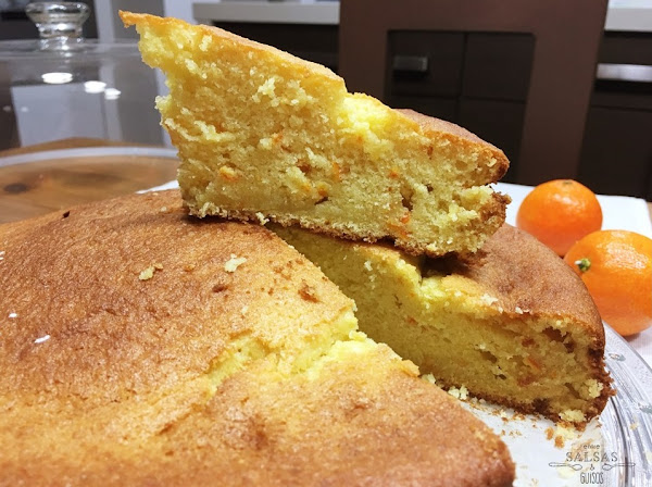 Preparamos un bizcocho con mantequilla, azúcar, mandarinas, brandy, levadura química y huevo. Una vez mezclados los ingredientes cocinamos a 180º durante 40 minutos.