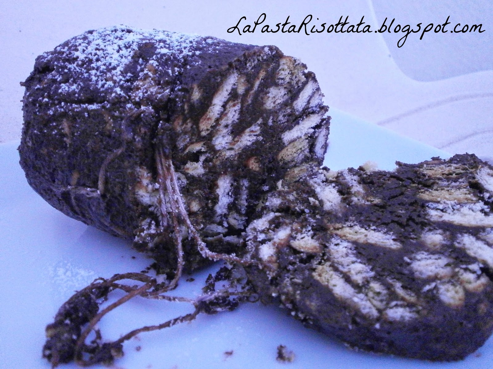 Salami de Chocolate de La Pasta Risottata, postre muy popular en Italia, una receta sencilla de hacer y ¡no necesita horno!. Comentaros que el blog es bilingüe, así que encontraréis la receta primero en italiano y más abajo en español.