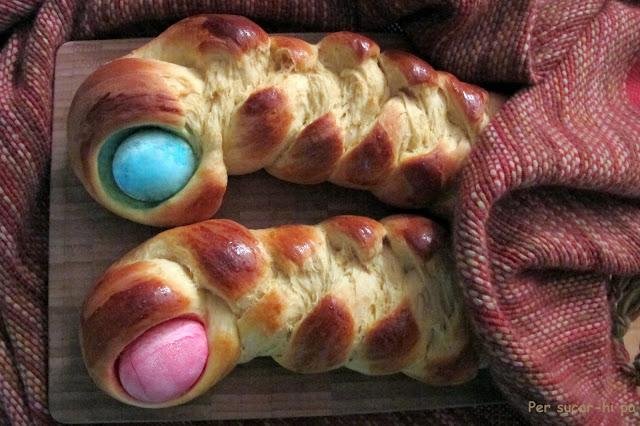 Se hace la masa trenzada y a la que se le coloca un huevo duro coloreado; se lleva al horno y se pinta con huevo y azúcar. Todos los detalles de la receta nos las da Pilar del blog Persucar-hi pa.