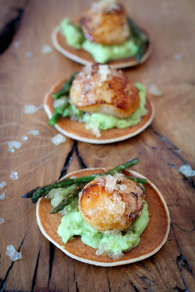 La receta que os traigo hoy es ideal para un día especial, un aperitivo original y diferente, con el que sorprenderéis a todo el mundo, y además resulta muy sencillo de hacer y en menos de 30 minutos lo tendréis listo para sorprender a vuestros invitados. Son unos blinis salados con mayonesa de aguacate, vieira a la plancha con espárragos y caviar cítrico. Las vieras, como siempre de Mariskito, mi ...