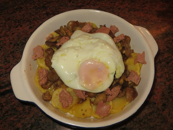 Se limpian las setas (la cantidad puede variar) y se cortan en trocitos con las manos, después se salpimentan y se ponen a freír en un chorrito de aceite. Mientras se fríen se pelan las patatas, se rallan y se les añade la sal, la pimienta y las hierbas aromáticas.