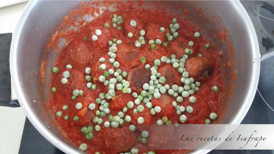 Cuando veamos que están hechos, incorporamos la albóndigas con los jugos que hayan soltado en el plato, el tomate, la hoja de laurel y los guisantes congelados al gusto. Ponemos el fuego al máximo y cuando veamos que comienza a hervir, bajamos a fuego medio, agregamos sal al gusto y la cucharadita de azúcar y dejamos que se haga todo alrededor de 25 minutos. Removemos con cuidado de vez en cuando para que las albóndigas no se peguen al fondo de la cazuela.