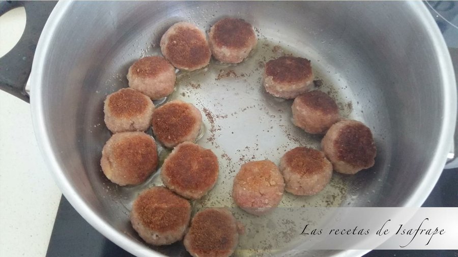 En una olla o cazuela ponemos el aceite a calentar y vamos añadiendo las albóndigas. Las hacemos por fuera a fuego medio, no importa que queden crudas por dentro. Las vamos sacando con la ayuda de una espumadera y las depositamos en una fuente o plato.