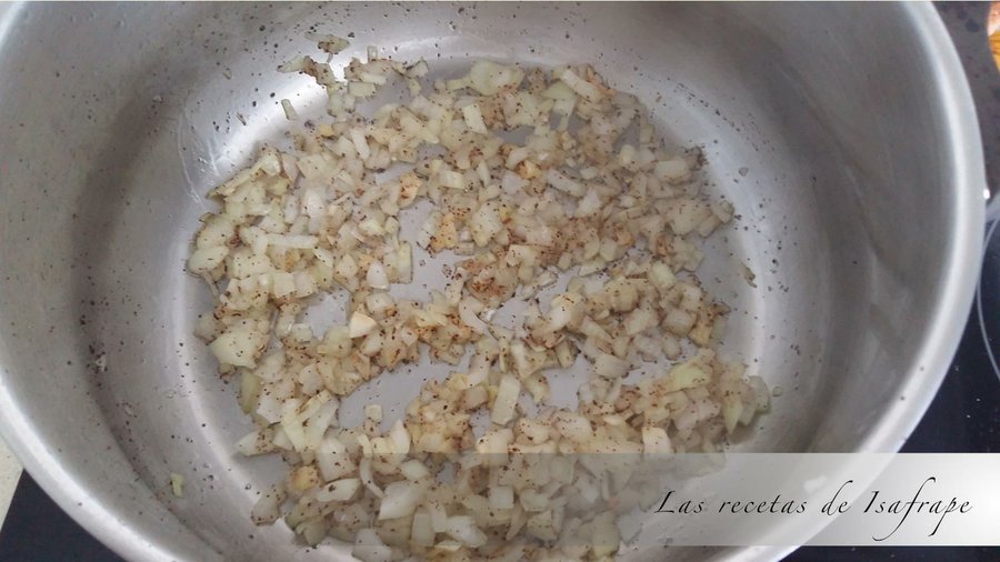 En el aceite que nos ha quedado con los jugos de la carne vamos a sofreír, pelados y picados, la cebolla y el diente de ajo a fuego medio.