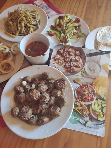 Para servir, hacemos brochetas con dos albóndigas y colocamos la salsa de queso en un recipiente para mojarlas a medida que las comemos. Yo las acompañé también de patatas barbacoa.