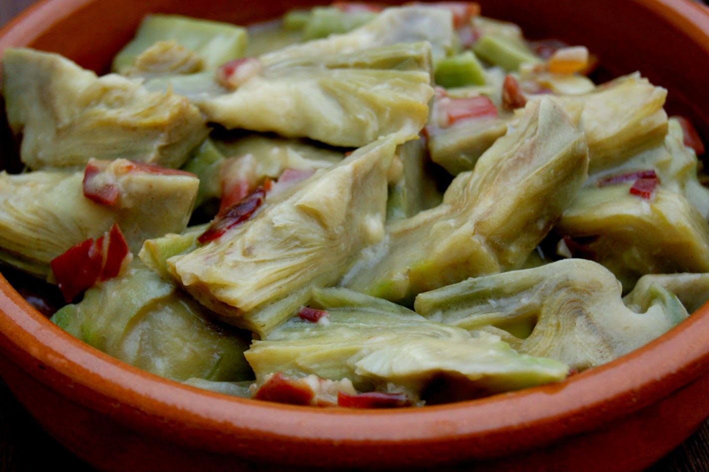 Cuando esté pochado añadir la harina y freír un poco, agregar el vino, rectificar de sal, dejar que se evapore el alcohol e incorporar las alcachofas partidas por la mitad y echar agua hasta que la salsa se aclare un poco, dejar cocer 3-4 minutos hasta que esté todo integrado.