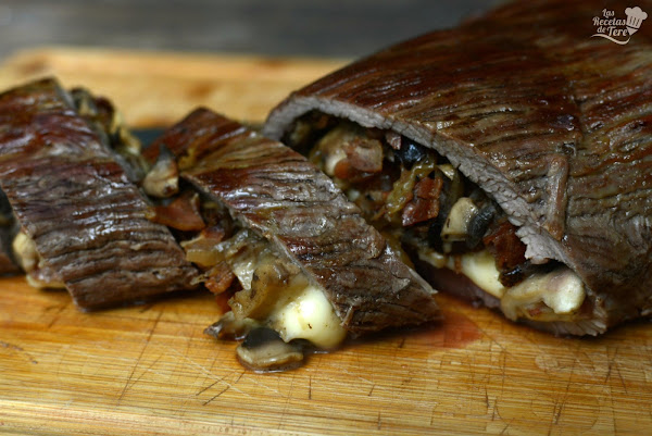 Aleta de vaca 1 kg. jamón serrano 150 gr. huevo 2 unidades miga de pan 30 gr. hierbas aromáticas 1 ramillete vino de jerez 1/3 de taza cebolla grande 1 unidad aceite de oliva 4 cucharadas pimienta negra 6 unidades salAplastar bien la aleta para ponerla fina y extenderla en una mesa o tabla. Salpimentar. Batir uno de los huevos y agregar las hierbas picadas, una cucharada de vino, sal y la miga de pan; mezclar bien. Cocer el otro huevo, pelarlo y trocearlo. Extender la mezcla del pan sobre la carne, colocar las tiras de jamón sobre ella y espolvorear el huevo duro. Doblar sobre sí mismo, formando un rollo y atar con cuerda de cocina.