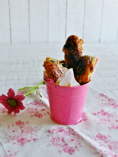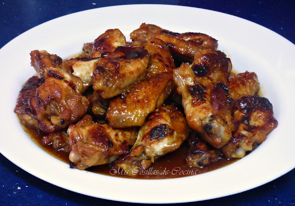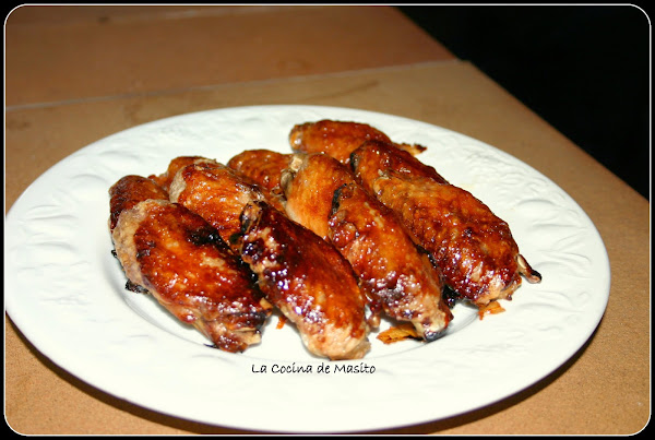 pimienta negra Poneis en una bandeja de horno papel vegetal para que no se peguen, colocais las alitas, salpimentais y al horno que previamente habeis precalentado a 180º durante unos 20 minutos, pero el tiempo depende del horno, asi que id vigilandolas Pasado ese tiempo, las dais la vuelta y volveis a introducir en el horno otrs 15 minutos mas o menos, digo lo mismo, depende del horno Cuando ya quede poco para que esten listas, echais en un bol la miel y la meteis en el micro para que sea mas facil pintar las alitas, pero ojo, meterla unos 20 segundos nada mas que es para que se ponga liquida solo Una vez listas, las pintais con cariño, y las volveis a meter en el horno unos 3 minutos ¡y listo! ¡A emplatar!¡BUEN PROVECHO!