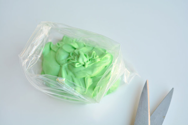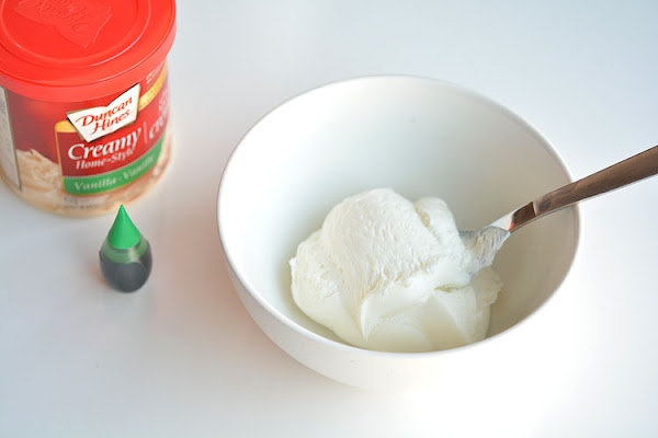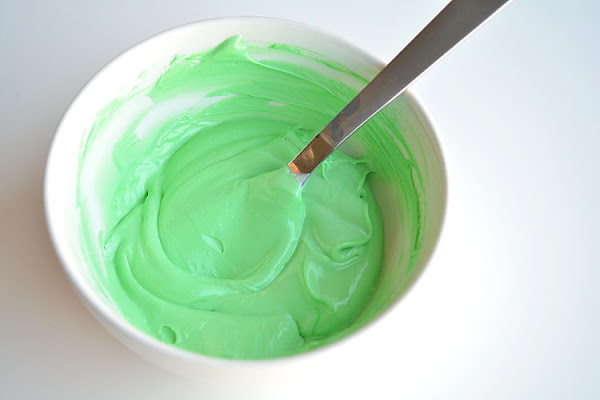 4. Con 12 triángulos, vamos a decorarlo cómo se merece , empezando por un glaseado al que hay que añadir el colorante verde, por lo menos unas 40 gotas. Remover hasta conseguir el color deseado.