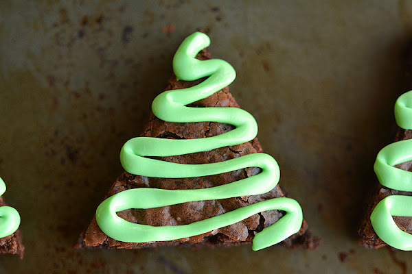 5. Meter el glaseado en un manda pastelera o bolsa de plástico y decorar los triángulos de brownie.