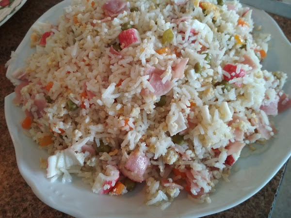 arroz,huevo,guisantes,gambas,fiambre de pavo,zumo de piña,agua,maizena,colorante,azucar vinagre,salEsta semana para comer me apetecía un poco de arroz al estilo chino, pero casero.
