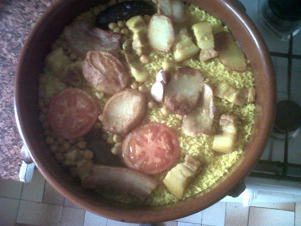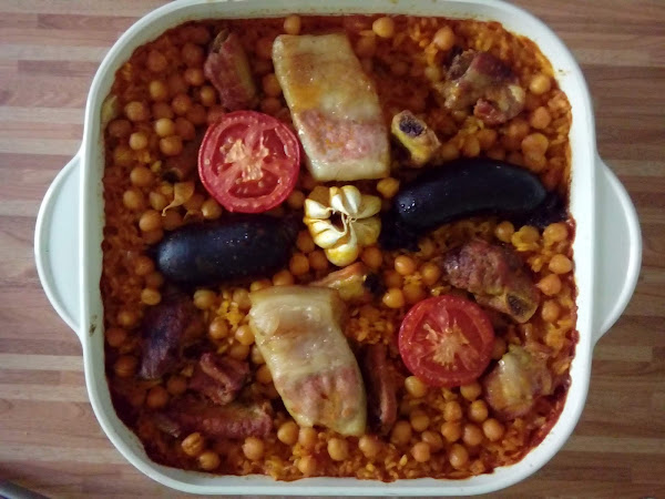 Se sofríe las costillas con los ajos, se ponen a cocer las costillas en la olla rápida junto con los garbanzos y la pastilla de caldo durante 15 minutos, se apaga el fuego y se deja 5 minutos mas en la olla tapada.En el mismo aceite se sofríe las longanizas, las patatas, las morcillas y se reservan, se retira un poco de aceite y se sofríe un ajo picado, cuando dore un poco se le añade los 4 tomates rallados, cuando esta sofrito se le añade el pimentón y el arroz, se mezcla bien durante un minuto y se vierte en la cazuela de barro que contiene las longanizas y los ajos, se le añade las costillas cocidas y el caldo, se mezcla bien y se pone las patatas los tomates troceados y la morcilla.En el horno precalentado a 200 grados se hornea durante 30 minutos se saca y se deja reposar 5 minutos y a comer.
